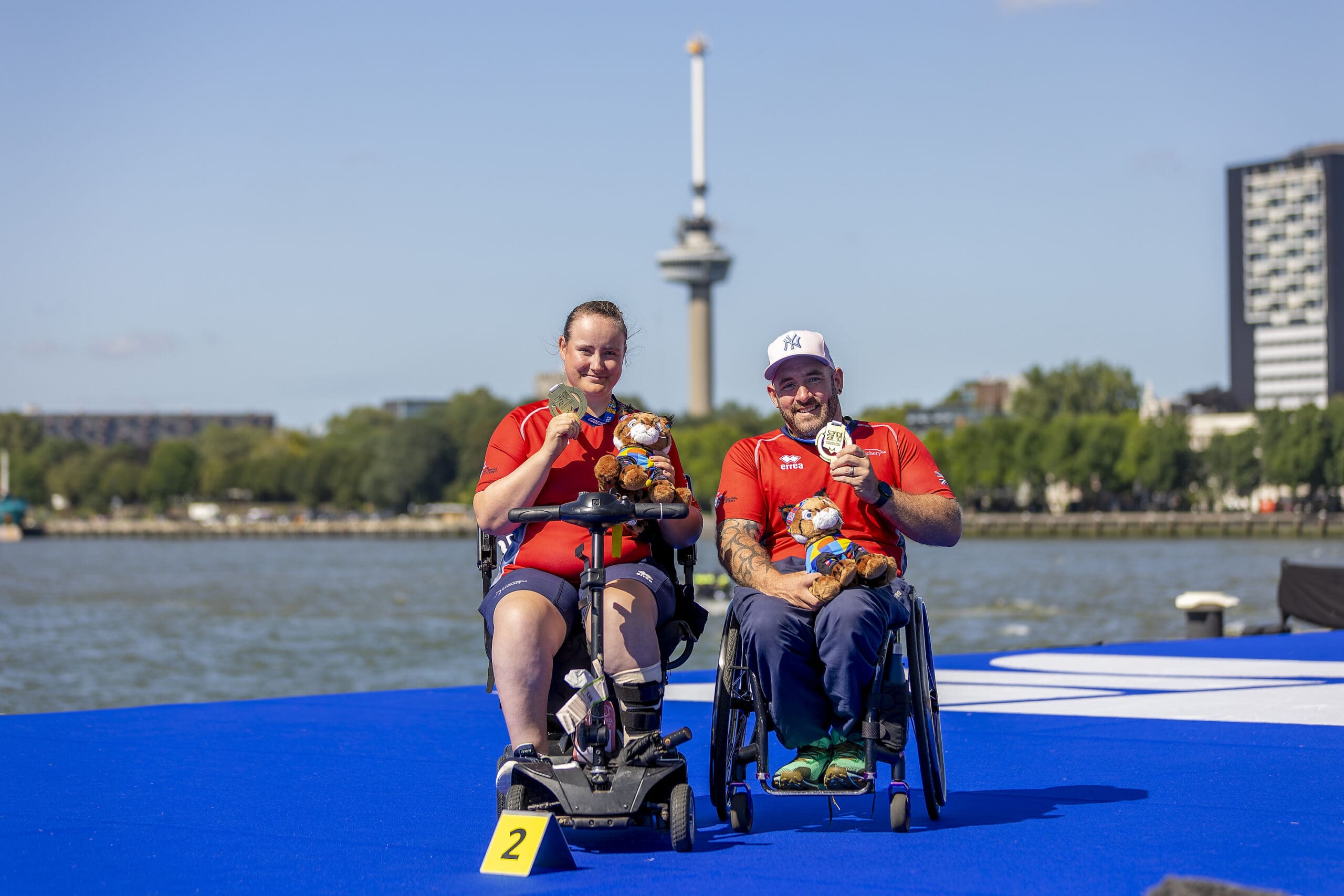 (Photos left to right: Ella Gibson, Phoebe Paterson Pine & Nathan Macqueen and Dave Phillips and Cameron Radigan after achieving their gold medal (Credit: Izzy Carpenter and European Para Championships).