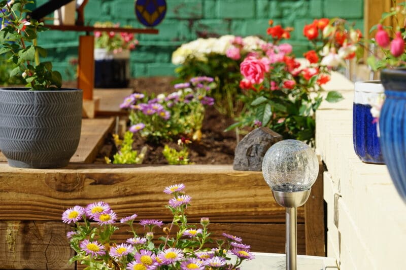 Where once stood old garden furniture on tired paving slabs surrounded by faded planters and an uneven patch of grass there now stands modern colourful chairs and an attractive wooden dining table. Sleepers form a raised bed housing a beautiful selection of plants providing a seating area for tenants and visitors.