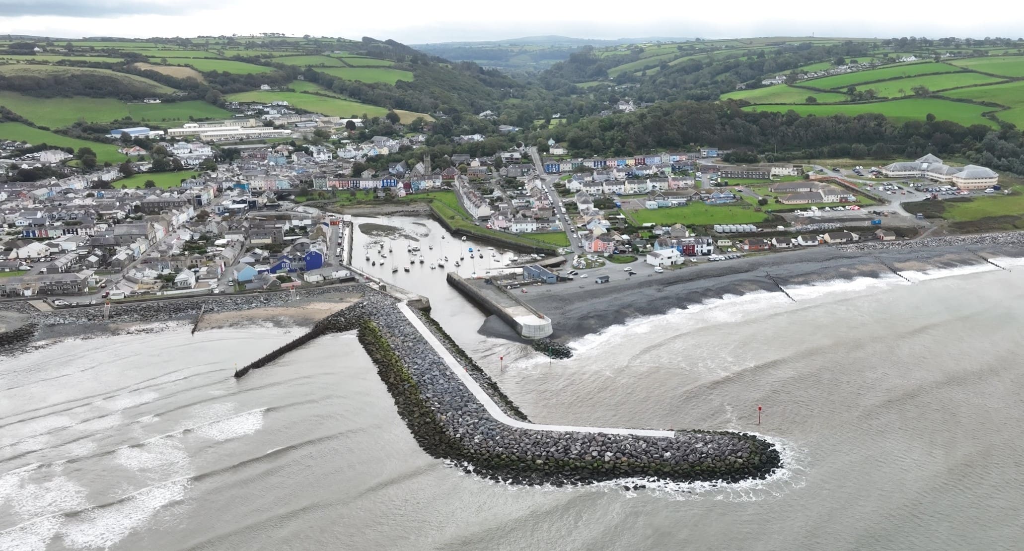 The 2023-approved scheme included the construction of a rock breakwater extending out from North Pier, refurbishment and re-building of pier head of South Pier, construction of flood walls, construction of flood gate at Pwll Cam inner harbour and improvements to the existing defences on South Beach.