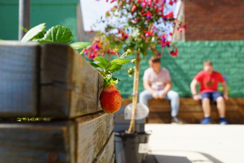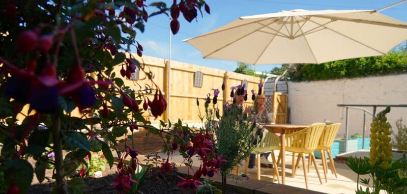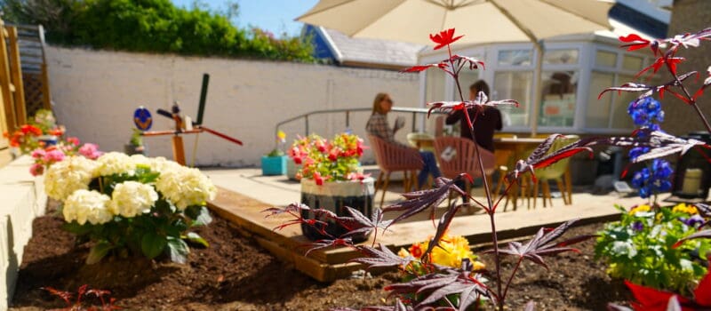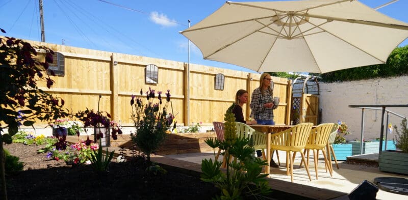 Where once stood old garden furniture on tired paving slabs surrounded by faded planters and an uneven patch of grass there now stands modern colourful chairs and an attractive wooden dining table. Sleepers form a raised bed housing a beautiful selection of plants providing a seating area for tenants and visitors.
