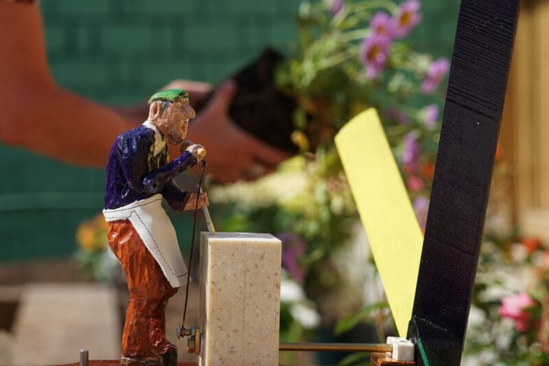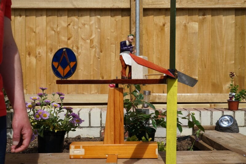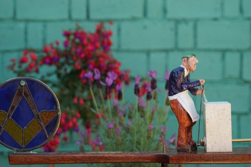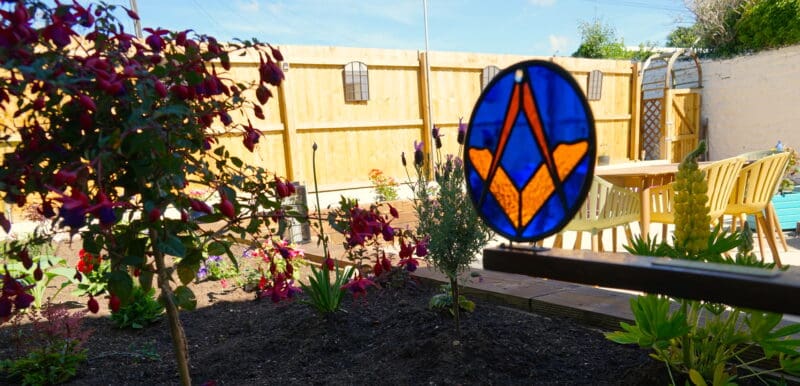 There is a delightful wind powered garden feature designed by Philip Barton, a member of the St Elli Lodge, which contains a stained glass square and compass and a male figure cutting a square block with a stonemason’s hammer and chisel.